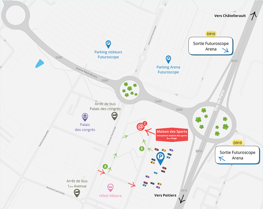 Depuis la D910, prenez la sortie Futuroscope (n°28). Suivez ensuite la direction Arena / Palais des Congrès. Pour vous garer, tournez à gauche avant l’hôtel Alteora.