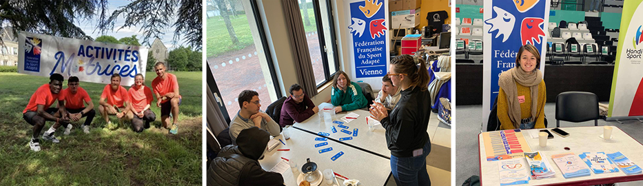 L’équipe intervient dans les écoles primaires, collèges, lycées, mais aussi auprès des infirmières scolaires, des clubs et district de foot de la Vienne pour expliquer, montrer, et faire connaître les réalités du sport adapté.